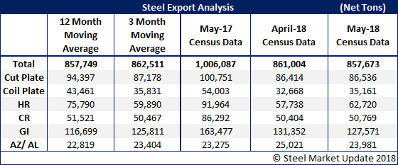 U.S. steel exports in May 2018 totaled 857,673 net tons (778,069 metric tons), flat over April but down 14.8 percent from May 2017 (which was at a 30-month high). Total exports have averaged around 860,000 tons the last few months. The total May export figure is a few thousand tons below the three-month moving average (average of March 2018, April 2018 and May 2018), and just a hair below the 12-month moving average (average of June 2017 through May 2018). Here is a breakdown of flat rolled and plate steel exports: