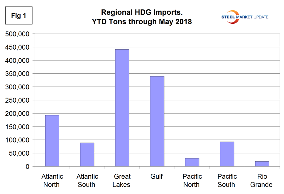 Figure 1 shows the year-to-date tonnage of HDG imports for each of seven regions. The Great Lakes received the most tonnage with 36.7 percent of the total followed by the Gulf with 28.2 percent. The whole Pacific coast, from San Diego to Anchorage, only received 10.1 percent.