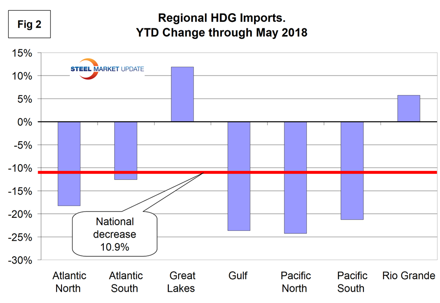Imports of hot-dipped galvanized sheet into the U.S. as a whole were down by 10.9 percent year to date through May, according to Steel Market Update’s latest analysis of Commerce and ITC data.