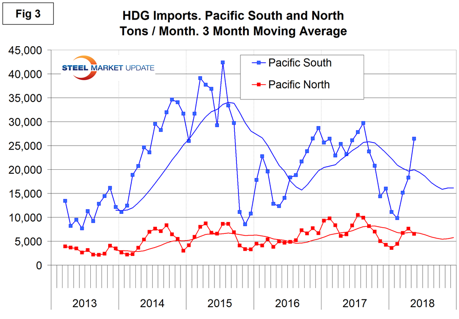 Figures 3, 4, 5 and 6 show the history of HDG sheet imports by region since March 2013 on a three-month moving average basis with a computer driven trend projection through the end of the year.