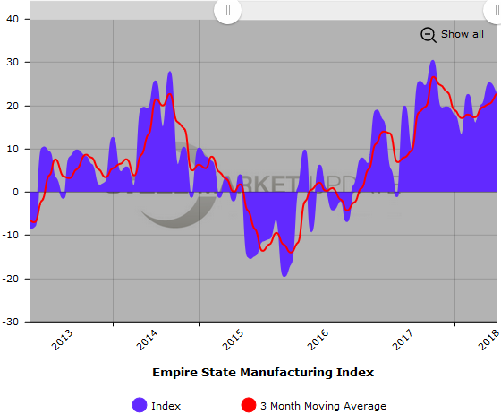 Below is a graph showing the history of the Empire State Manufacturing Index. You will need to view the graph on our website to use its interactive features; you can do so by clicking here. If you need assistance logging in to or navigating the website, please contact Brett at 706-216-2140 or Brett@SteelMarketUpdate.com.