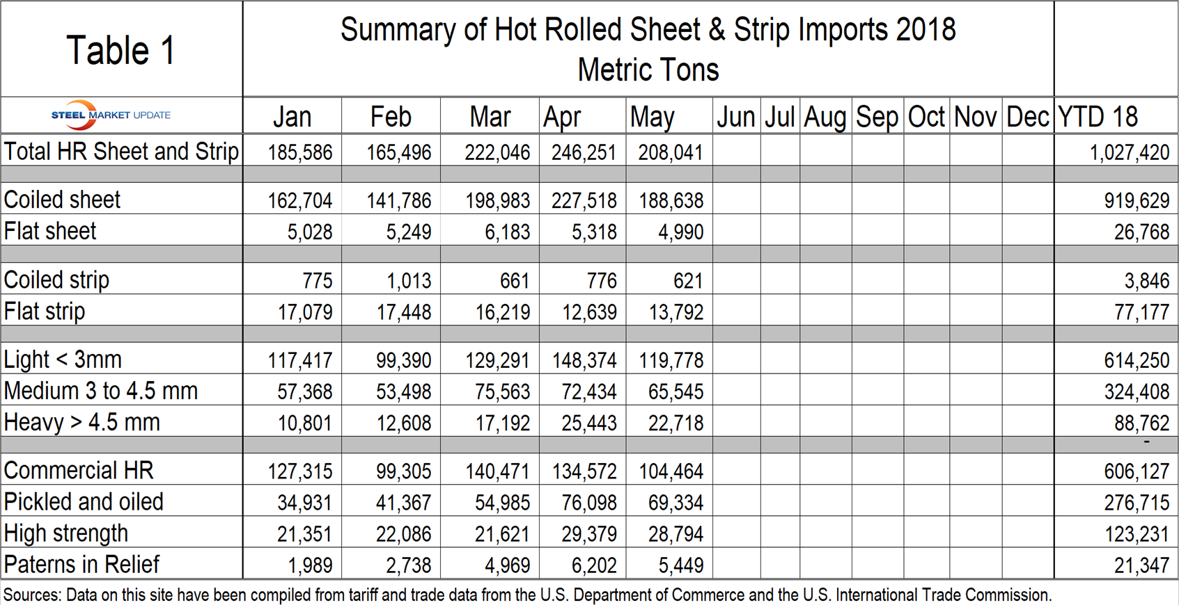 Premium subscribers to Steel Market Update have access to reports on SMU’s website that break out the import tonnage into district of entry and source nation for six sheet and plate categories. SMU has now developed reports that drill down to provide more product detail on hot rolled and cold rolled coil. We report these in alternate months. This month we will focus on hot rolled. Our August report will cover cold rolled.