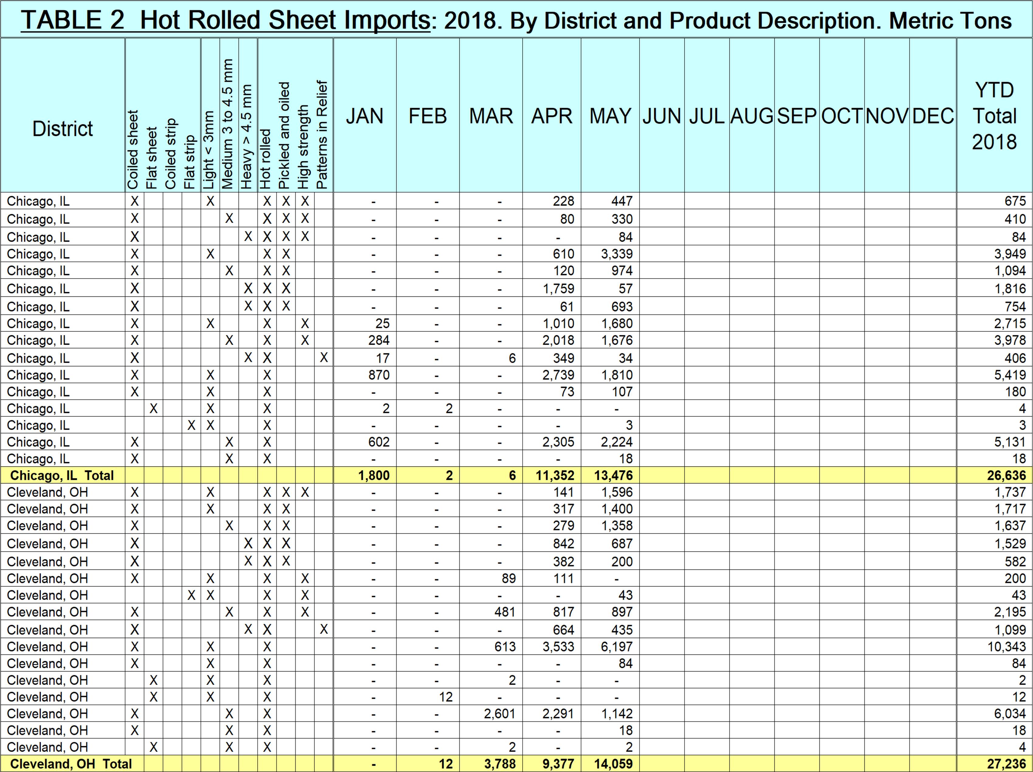 Table 2 (click to enlarge) is a small part of a sheet that shows detail for every region in the U.S. and is available in the premium section of our website. It shows the product detail of hot rolled sheet and strip imports by district of entry. For example, the largest tonnage item entering Chicago in the first five months of 2018 was light gauge coiled sheet. Pointing to another example, if a steel buyer wanted to know how much light gauge, high strength, pickled and oiled coiled sheet had come into Cleveland year to date, the answer is 1,737 metric tons.