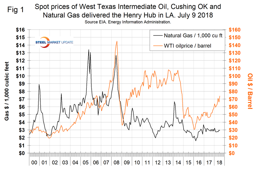 Figure 1 shows historical oil and gas prices from January 2000 through July 13, 2018. Our price and inventory data come from the Energy Information Administration (EIA). The price of natural gas at the Henry Hub in Louisiana, except for a few short-lived spikes, has made no progress in two years. Gas closed at $2.91 on July 6. The price of WTI was up by 144 percent from its recent low in January 2016.