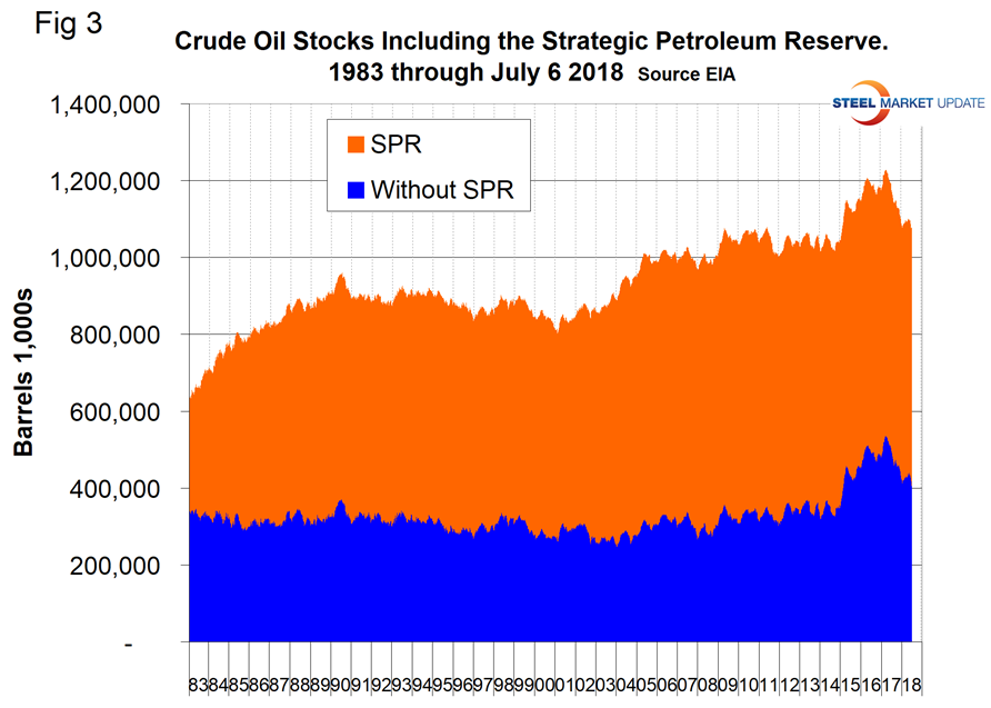 Figure 3 breaks total crude inventory into the working portion and the strategic petroleum reserve. Total inventories are down by 109 million barrels year over year.