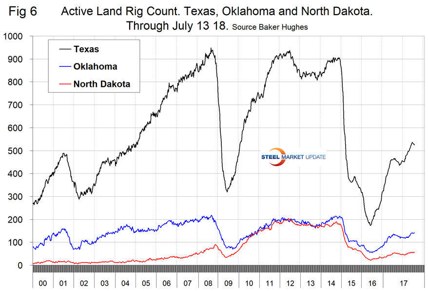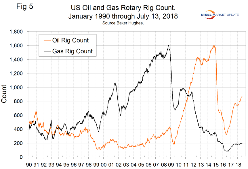 The oil rig count had a low point of 316 on June 27, 2016, and stood at 863 on July 13, 2018. The U.S. gas rig count rose from its low point of 81 on Aug. 5, 2016, to 189 on July 13. Since our last update on June 15, the oil count was unchanged and gas rigs were down by five. The year-over-year growth rate of total U.S. operating rigs was 10.7 percent in the latest data. Figure 5 shows the Baker Hughes U.S. Rotary Rig Counts for oil and gas equipment in the U.S. (explanation below).