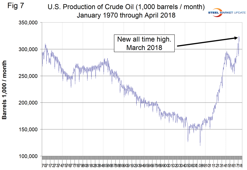 Figure 7 illustrates the monthly U.S. oilfield production of crude from January 1970 through April 2018 (latest data available) in thousands of barrels per month. The historical high was October 1970 at 310.4 million barrels. Production steadily declined to half that level in the late 2000s before the fracking revolution kicked in. December 2017 broke the old record with 310.7 million barrels produced and March set a new record at 324.7 million barrels. April declined to 314.0 million barrels.