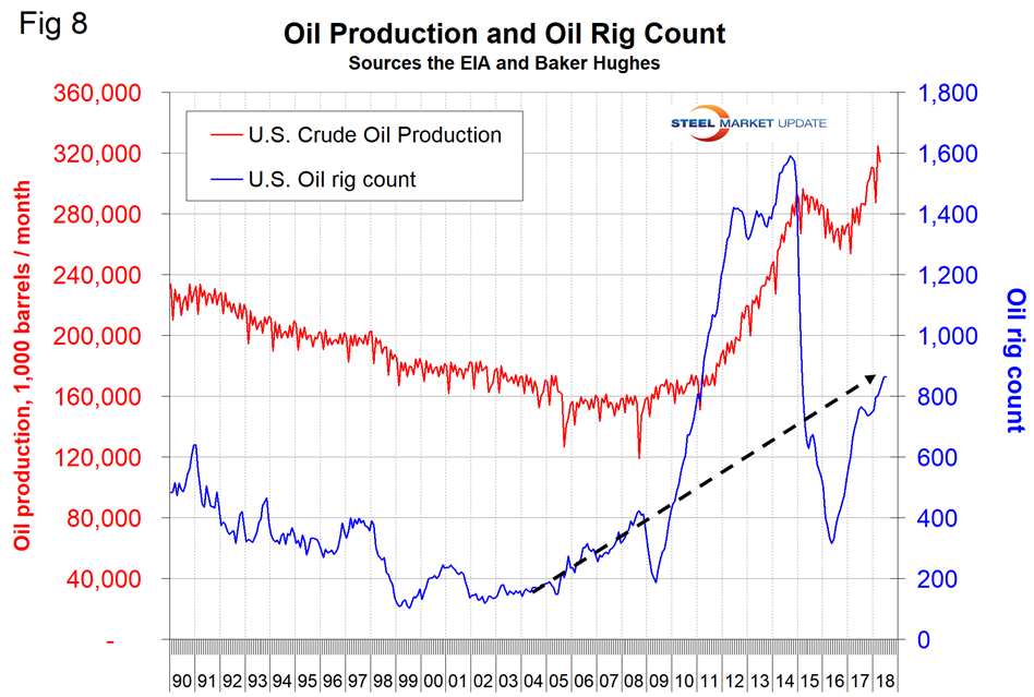 Figure 8 compares oil production and the oil rig count and shows how the increase in exploratory wells drove production from 2009 through late 2014 when the oil price collapsed. The subsequent decline in production was much less marked and is again increasing. Our take on this is that the huge increase in exploratory oil rigs beginning in 2009 may have been an anomaly and that we won’t see a repeat of the number operating in 2014 for a very long time.