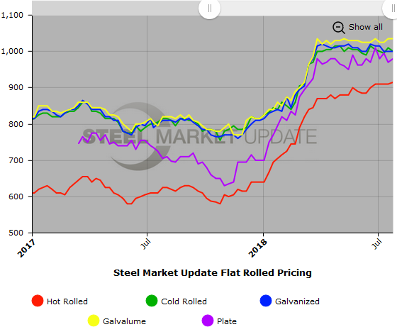 SMU Note: Below is a graphic showing our hot rolled, cold rolled, galvanized, Galvalume and plate price history. This data is available here on our website with our interactive pricing tool. Note that plate prices are not yet available on our website, but we are in the process of adding that dataset. If you need help navigating the website or need to know your login information, contact us at info@SteelMarketUpdate.com or 800-432-3475.
