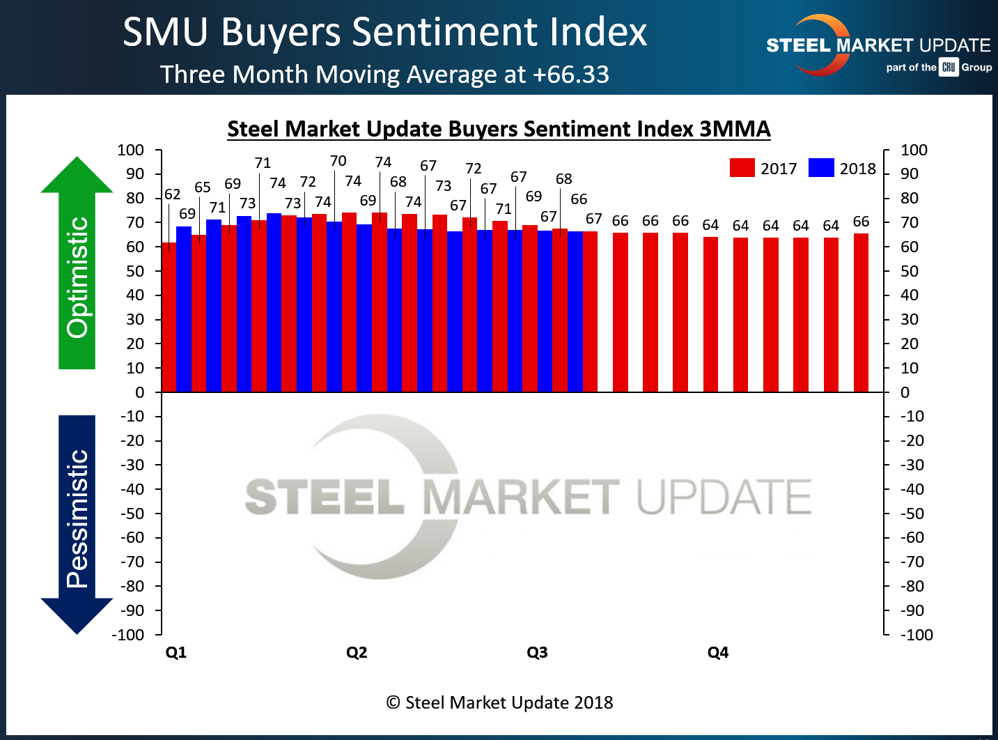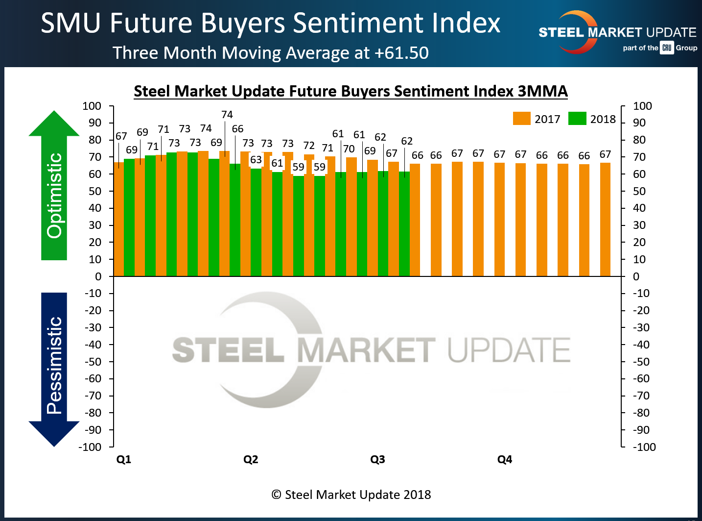 Future Sentiment, how buyers and sellers of flat rolled and plate steel view of their company’s ability to be successful three to six months in the future, also increased by 2 points to +63 from early July. The 3MMA for Future Sentiment inched down to 61.50 from 61.83 two weeks prior. The Future Sentiment Index appears to be stabilizing, but at numbers well below this point last year. This is troubling to Steel Market Update as Future Sentiment tradionally has been higher than Current Sentiment, and we are concerned the pessimistic trend may be forecasting trouble for the industry late this year or early into 2019. We will continue to watch developments with our Future Index closely in the weeks and months to come.