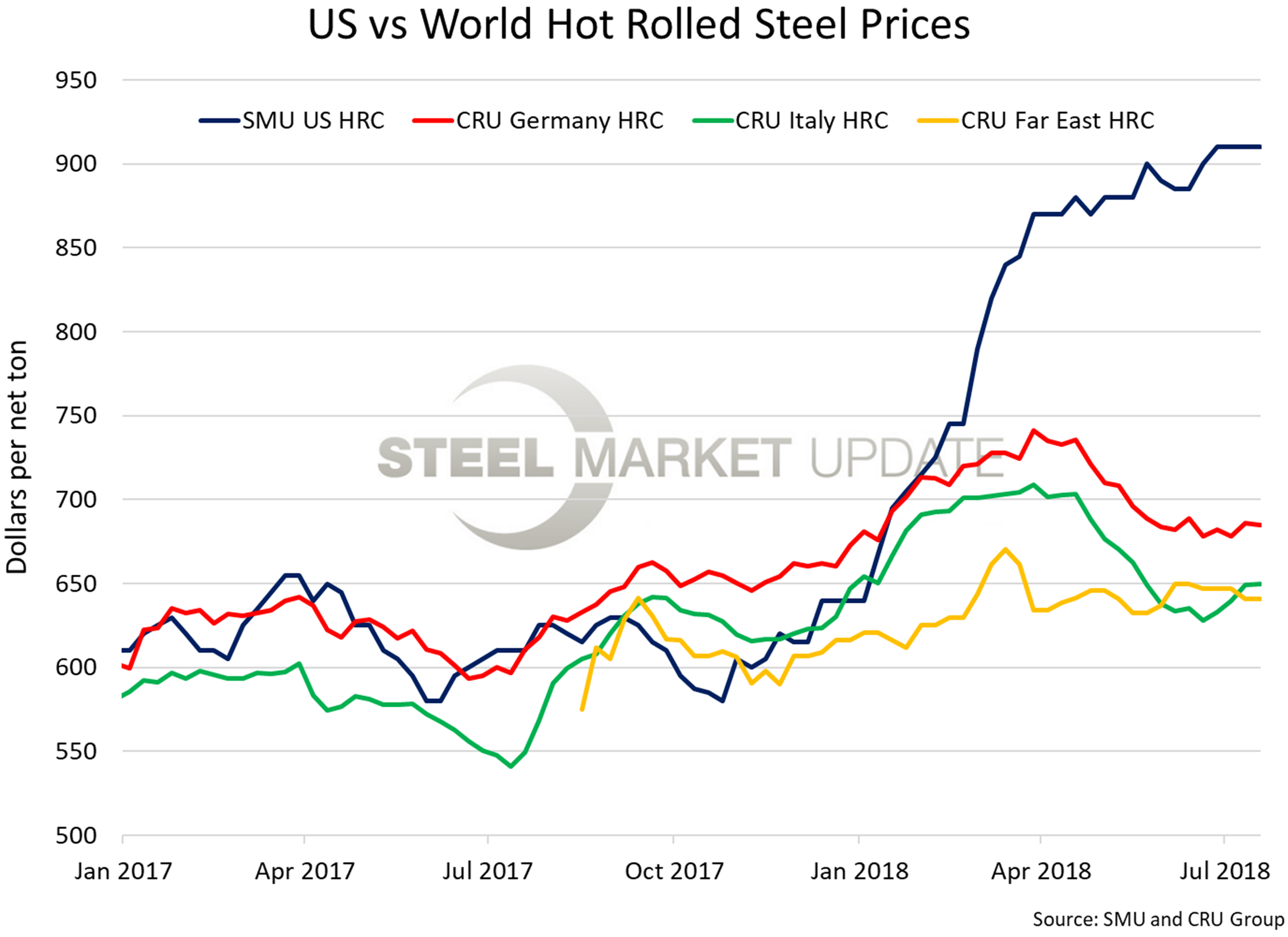 As of Wednesday, July 18, the CRU German HRC price was $595 per net ton, down $1 from the previous week. Adding $90 per ton for import costs, that puts the price at $685 per ton from Germany delivered to the U.S. The latest Steel Market Update hot rolled price average is $910 per ton for domestic steel, unchanged from last week. The spread between German and U.S. HR prices is now +$225 per ton, up from +$224 last week, and down from +$232 two weeks ago. That means domestic HR is now theoretically $225 per ton more expensive than importing HR steel from Germany. The four-week average price spread is now +$227 per ton, unchanged from last week.