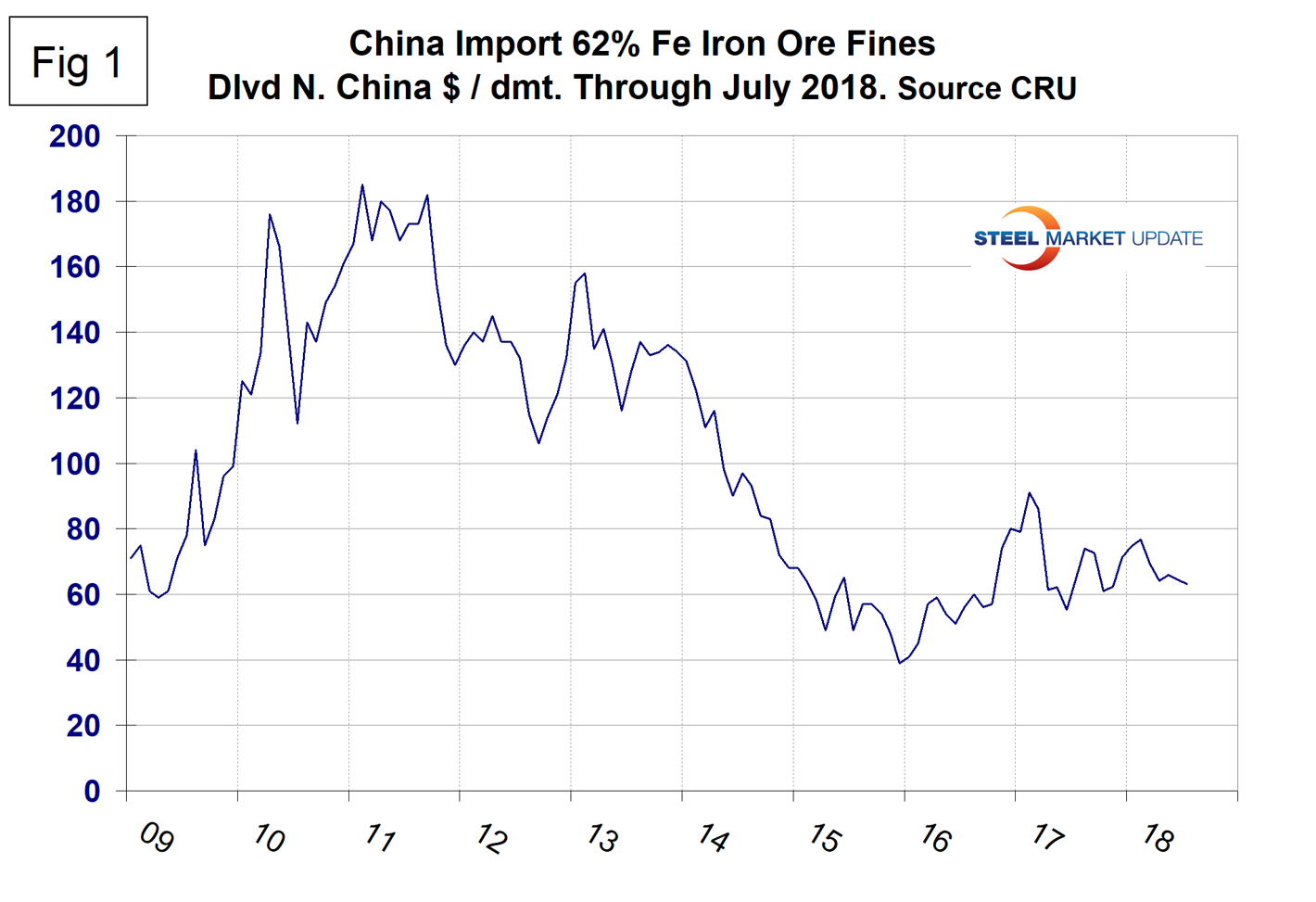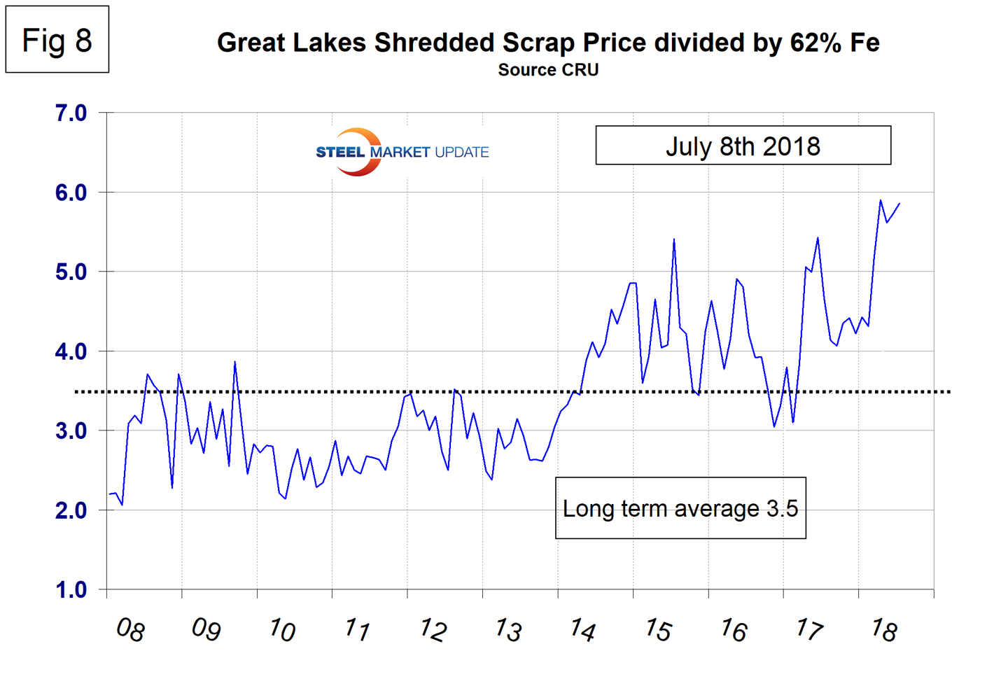 There is a long-term relationship between the prices of iron ore and scrap. Figure 7 shows the prices of 62% iron ore fines delivered N. China and the price of shredded scrap in the Great Lakes region through early July 2018. The correlation since January 2006 has been 82.54 percent.
