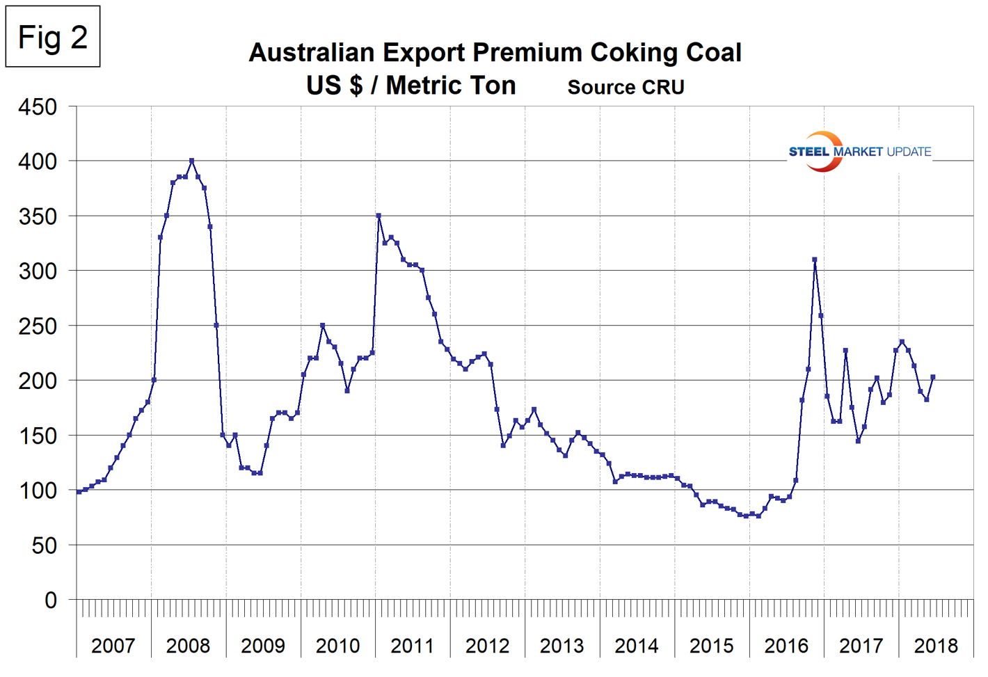 Coking coal prices have been erratic in the last two years. From February 2016 to November 2016, the price of premium low volatile coking coal more than quadrupled from $76 to $310 per metric ton. Since then the price has stabilized in the $200 range and in June stood at $203 (Figure 2).