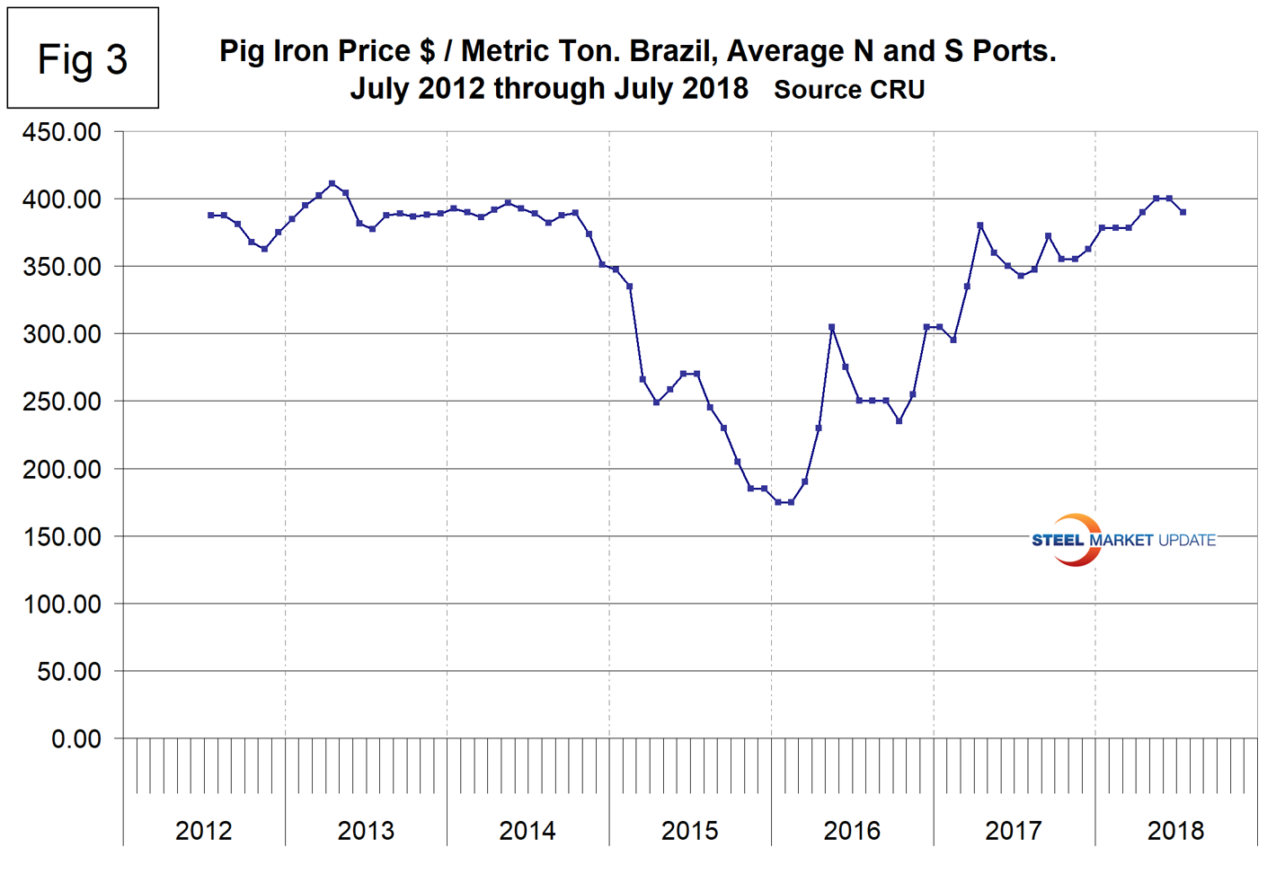 Most of the pig iron imported to the U.S. currently comes from Russia, Ukraine and Brazil with additional material from South Africa and Latvia. In this report, we summarize prices out of Brazil and average the FOB value from the north and south ports. The price steadily increased from the $175 low point in January and February 2016 to $400 in May and June 2018 before declining to $390 in July. Year over year, the price of Brazilian pig iron has increased by 13.9 percent (Figure 3).