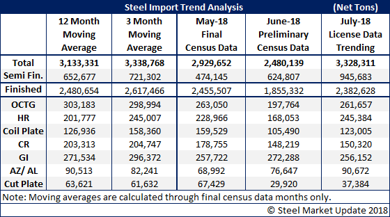 The trend for July license data (average daily licenses multiplied by 31 days) suggests imports could increase to 3.3 million net tons. Much of the growth, not surprisingly, will be in semi-finished steels used by domestic steelmakers, projected to increase by more than 50 percent from June. But imports of finished steel in July could increase by more than 24 percent, as well, if the trend plays out for the entire month.