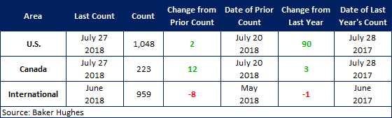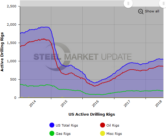 The U.S. active rig count, an indicator of oil country tubular goods demand, increased this week, according to oilfield services company Baker Hughes. The number of active U.S. rigs rose by 2 to 1,048, with oil rigs up 3 to 861 rigs, gas rigs down 1 to 186 rigs, and miscellaneous rigs unchanged at 1 rig. Compared to this time last year, the 1,048 count is up 90 rigs, with oil rigs up 95, gas rigs down 6, and miscellaneous rigs up 1. See the first graph below for a history of active U.S. rig counts.