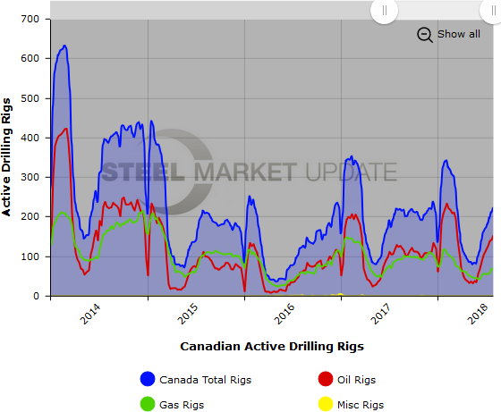 The Canadian rig count rose by 12 to 223 rigs, with oil rigs up 12 to 154 rigs, gas rigs unchanged at 69 rigs, and miscellaneous rigs unchanged at 0. Compared to last year, the 223 count is up 3 rigs, with oil rigs up 25, gas rigs down 22, and miscellaneous rigs unchanged. See the second graph below for a history of active Canadian rig counts.