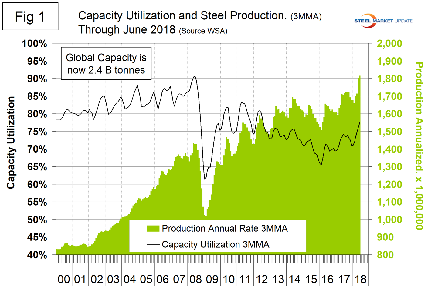 In 2017, total global steel production was 1.645 billion metric tons, up by 5.0 percent from 2016. In the six months through June 2018, global production was at an annual rate of 1.758 billion metric tons, smashing all previous records. Capacity utilization in June was 78.5 percent. The three-month moving averages (3MMA) of production and capacity utilization in April through June that we prefer to use were 151,326,000 metric tons and 78.5 percent, respectively. This was the highest capacity utilization since June 2012. Figure 1 shows monthly production and capacity utilization since January 2000. May and June were the first months for the annualized production rate to exceed 1.8 billion metric tons. On a tons-per-day basis, production in June was 5.046 million metric tons with a 3MMA of 4.989 million tons. This was another all-time high on both counts. In December 2016, the OECD’s steel committee estimated that global capacity would increase by almost 58 million metric tons per year between 2016 and 2018 bringing the total to 2.43 billion tons. That forecast is coming to pass as capacity is now 2.4 billion tons.