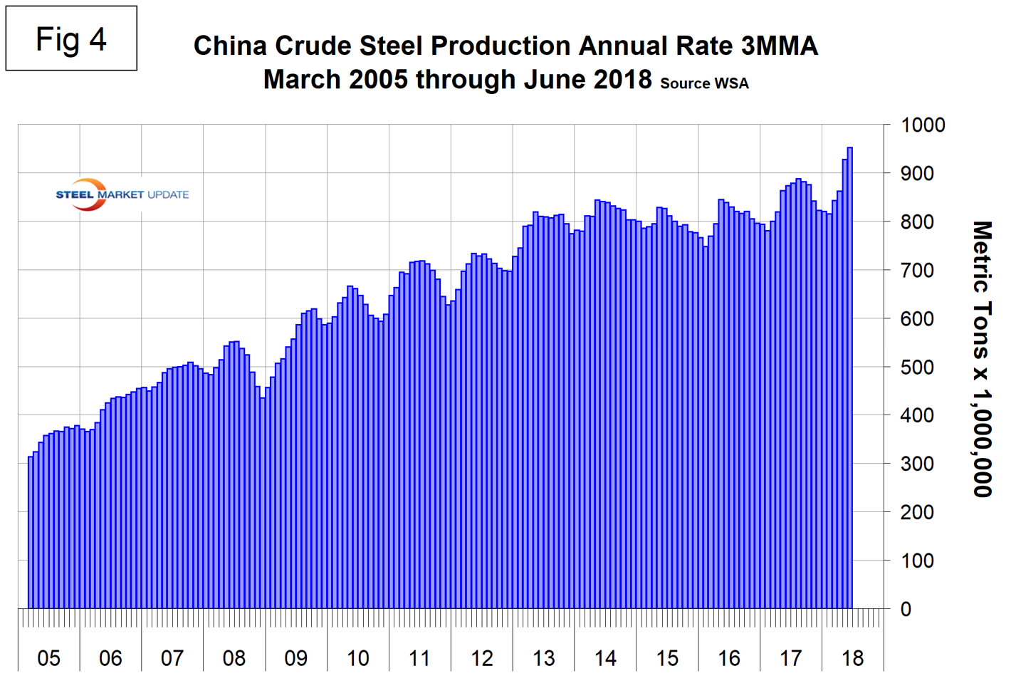 Figure 4 shows China’s production since 2005 and Figure 5 shows the year-over-year growth. Sequentially in the six months January through June 2018, China’s share of global production was 48.0 percent, 49.3 percent, 49.9 percent, 51.7 percent, 52.4 percent and 53.0 percent. As we have said before in these SMU updates, the much publicized capacity reductions in China are not the same thing as cutting production.