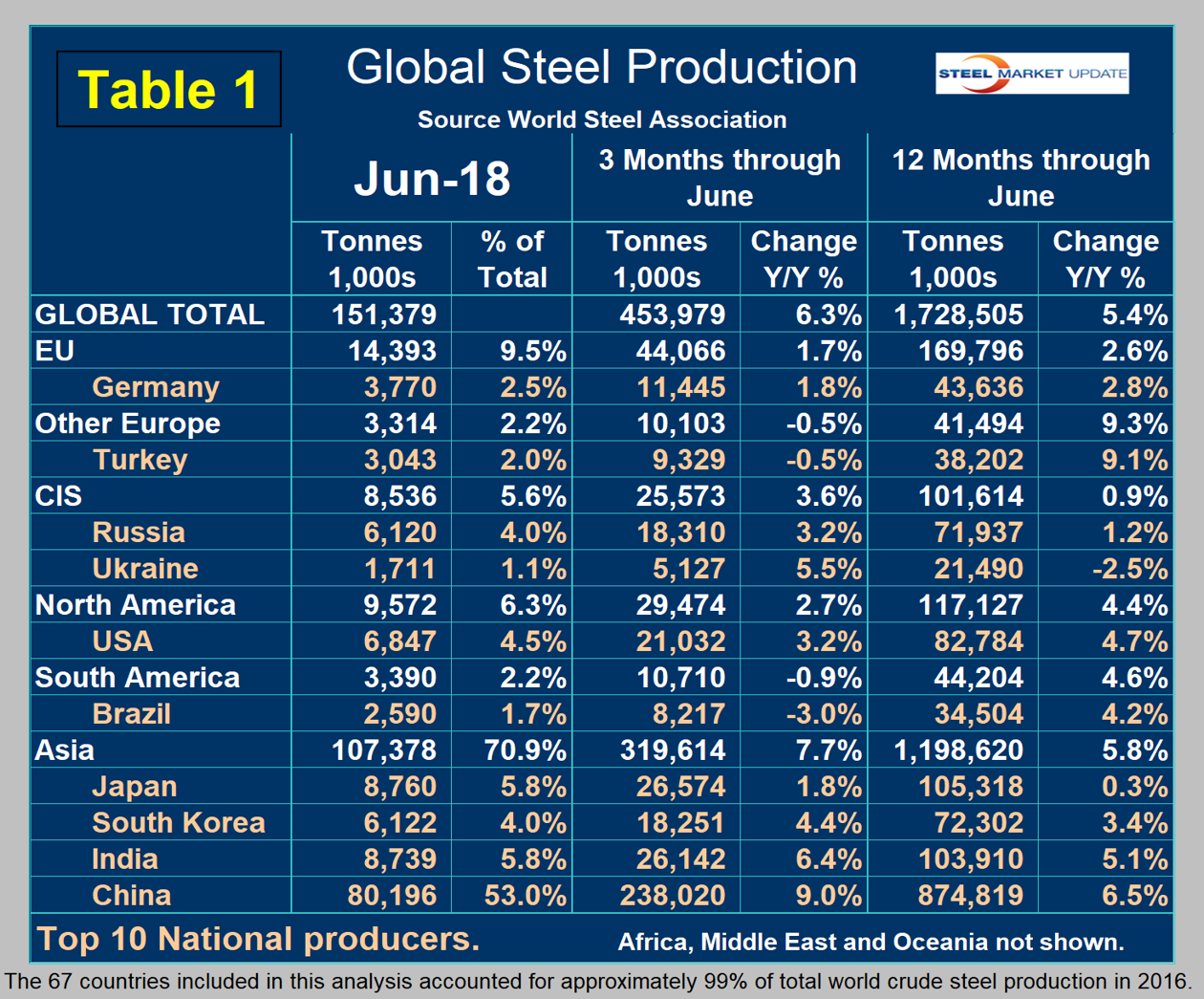 SMU Comment: Once again, production records tumbled in June. In the latest three months of data, China’s production grew almost three times as fast as the rest of the world. There have been reports that the One Belt One Road program will absorb the expanded output, but we don’t know the magnitude of that effect. Reality seems to be that old plants are being closed as existing ones increase production and new plants come on stream. In its April forecast, the IMF raised its projection for global growth in 2018 and 2019, which will have a positive effect on global steel consumption, particularly in the developing world.