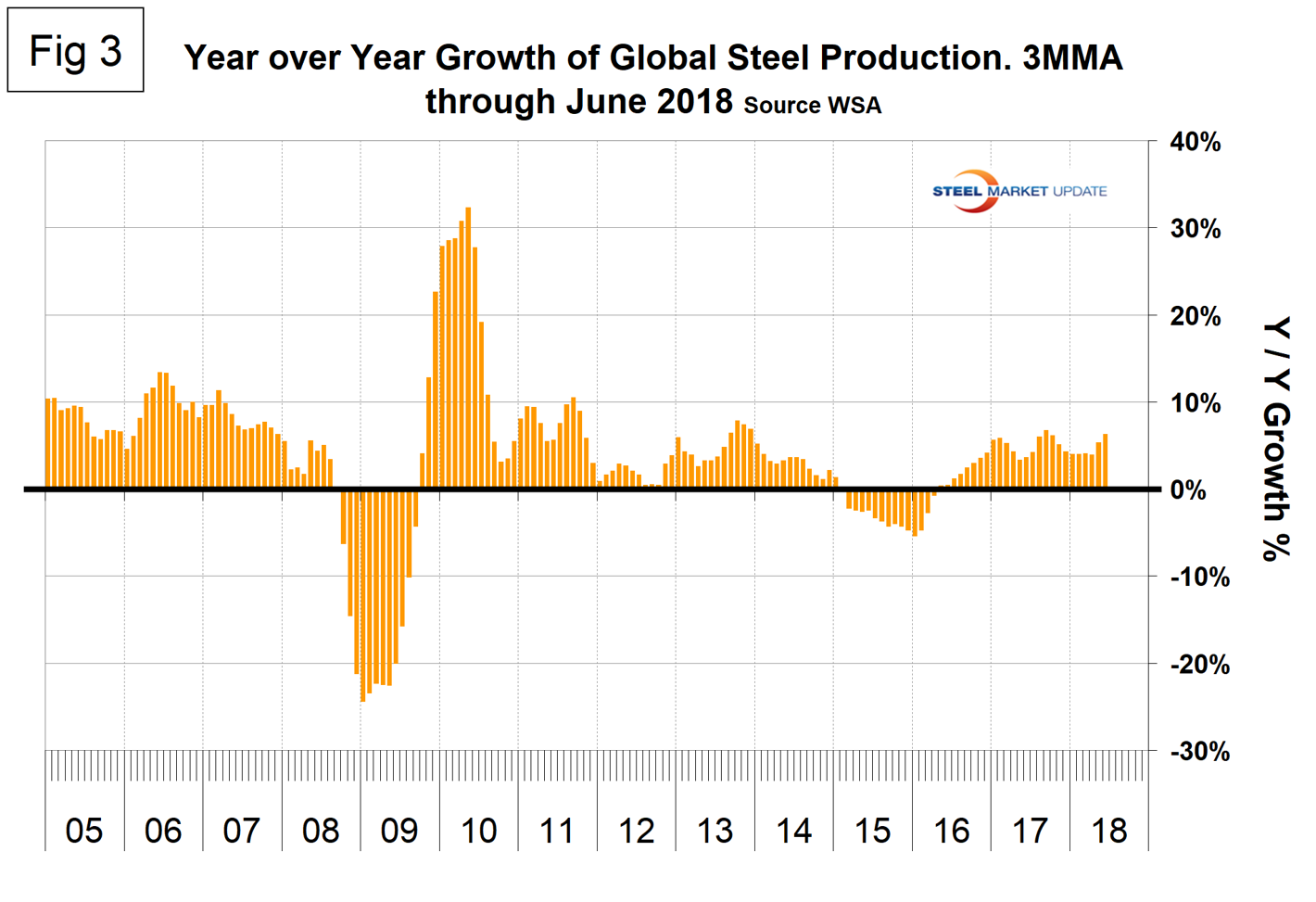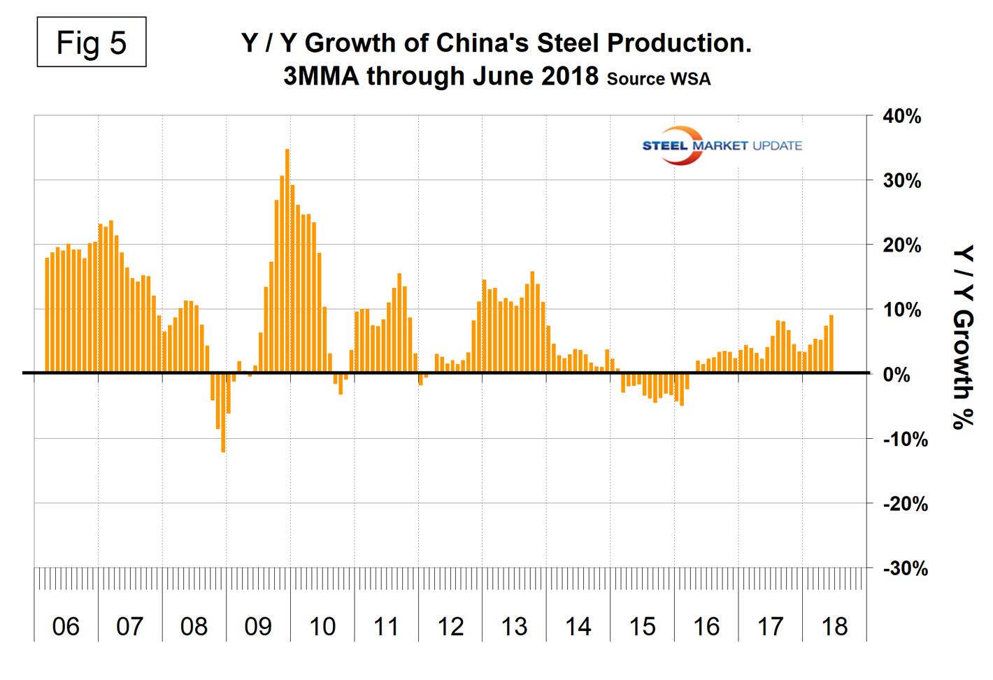 Figure 4 shows China’s production since 2005 and Figure 5 shows the year-over-year growth. Sequentially in the six months January through June 2018, China’s share of global production was 48.0 percent, 49.3 percent, 49.9 percent, 51.7 percent, 52.4 percent and 53.0 percent. As we have said before in these SMU updates, the much publicized capacity reductions in China are not the same thing as cutting production.