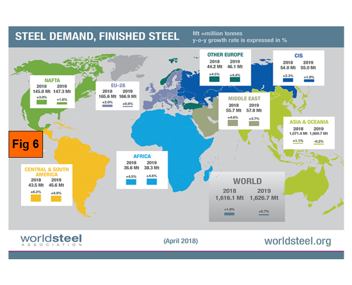 The April WSA Short Range Outlook (SRO) for apparent steel consumption in 2018 and 2019 is shown by region in Figure 6. WSA forecasts global steel demand will reach 1,616.1 million metric tons in 2018, an increase of 1.8 percent over 2017. In 2019, it is forecast that global steel demand will grow by 0.7 percent to reach 1,626.7 million tons. Commenting on the outlook, WSA Economics Committee Chairman T.V. Narendran said, “In the next couple of years, the global economic situation is expected to remain favorable with high confidence and strengthening recovery of investment levels in advanced economies. Benefitting from this, steel demand in both developed and developing economies is expected to show sustained growth momentum with risks relatively limited. However, possible adverse impact from rising trade tensions and the probable U.S. and EU interest rate movements could erode this current momentum.” The outlook for steel demand in the U.S. remains robust on the back of the strong economic fundamentals – strong consumption and investment due to high confidence, rising income and low interest rates. The manufacturing sector is being supported by a low dollar and increasing investment, while rising housing prices and steady non-residential sector growth point to a healthy construction sector. Though the recent tax reform is further expected to boost steel demand through its positive impact on investment, there is some concern over a possible overheating of the economy. The announced infrastructure plan is unlikely to affect steel demand in the short term.”
