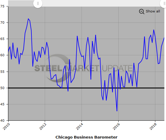 Below is a graph showing the history of the Chicago Business Barometer. You will need to view the graph on our website to use its interactive features; you can do so by clicking here. If you need assistance logging in to or navigating the website, please contact Brett at 706-216-2140 or Brett@SteelMarketUpdate.com.