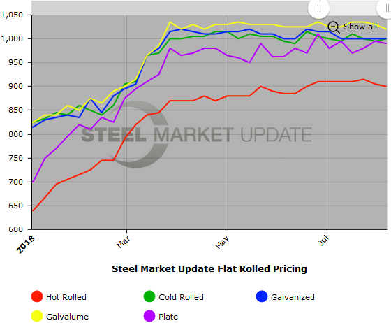 SMU Note: Below is a graphic showing our hot rolled, cold rolled, galvanized, Galvalume and plate price history. This data is available here on our website with our interactive pricing tool. Note that plate prices are not yet available on our website, but we are in the process of adding that dataset. If you need help navigating the website or need to know your login information, contact us at info@SteelMarketUpdate.com or 800-432-3475.