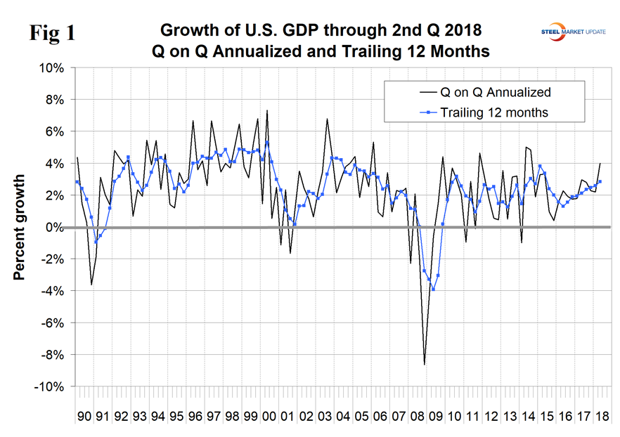 The U.S. economy grew at a 4.1 percent rate in the second quarter, up from 2.2 percent in the first quarter, according to the government’s first estimate of the gross domestic product. Growth of second-quarter GDP was the best since third-quarter 2014, and on a trailing 12-month basis has improved for the last eight quarters, according to Steel Market Update’s latest analysis.