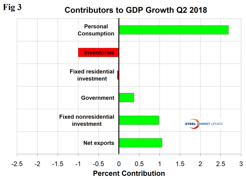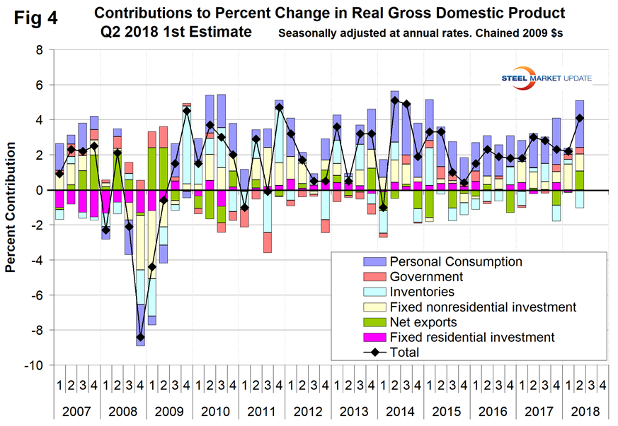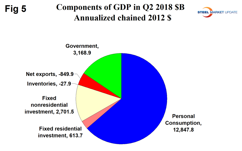 SMU Comment: This was an excellent result and exceeded the CBO forecast of a 3.5 percent increase. We should expect a decline in the growth of GDP every quarter from now until Q3 2021 if the CBO forecast is correct. The trailing 12-month growth rate has improved for each of the last eight quarters and in Q2 reached 2.85 percent. We think this is a more valid measure of how the economy is really progressing than the headline number. However, the trailing 12-month result is high enough to stimulate future steel consumption, which requires about a 2.2 percent growth to break even.