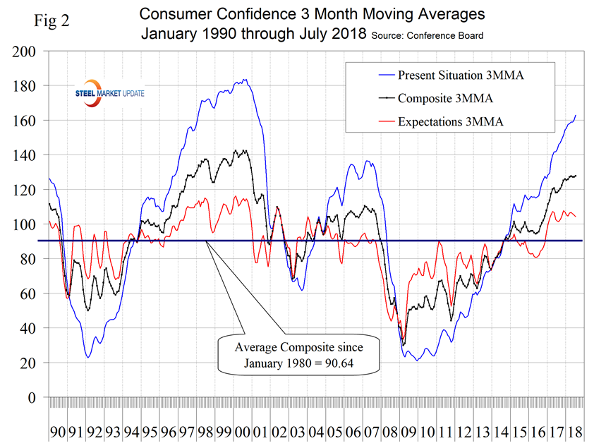 All three measures are higher than they were at the pre-recession peak of 2007. Expectations have been relatively constant for over a year, but the consumer’s view of the present situation has been surging since December 2010. Comparing July 2018 with July 2017, the 3MMA of the present situation was up by 19.6 and expectations were up by 2.7 points (Table 1).