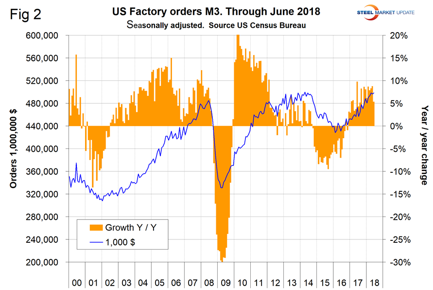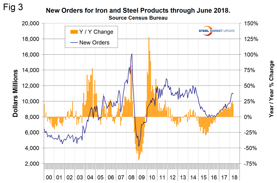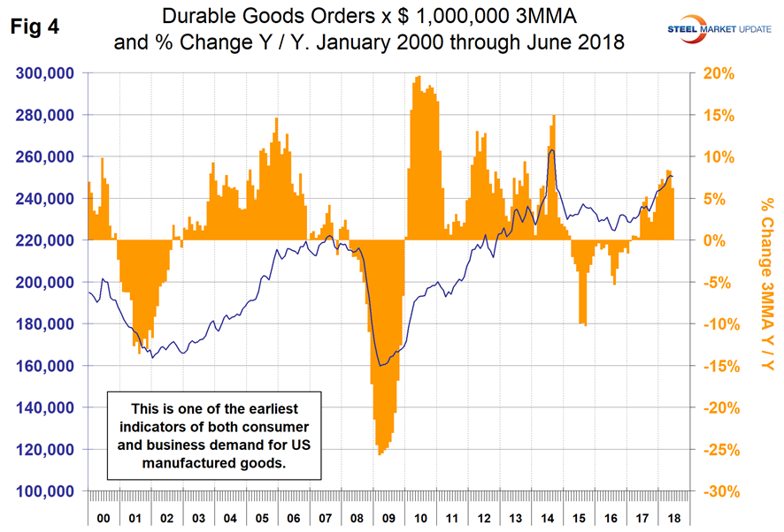 Within the Census Bureau M3 manufacturing survey is a subsection for new orders for iron and steel products. Figure 3 shows the history since January 2000 with an excellent growth rate of 20.1 percent year over year for May 2018, which was the third straight month at greater than 20 percent. Data at this level of detail is one month behind the advance report that covers total U.S. factory orders. New orders for iron and steel products in May were up by 36.2 percent from the recent low in August 2016.
