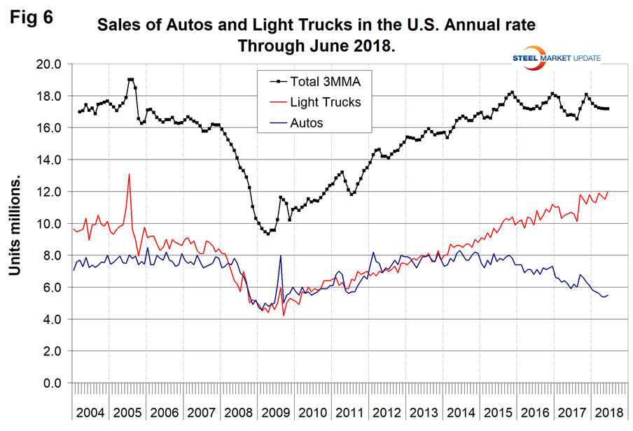 Our past reports have included auto assembly data for the U.S., Canada and Mexico, but that source has dried up, so we are reporting on U.S. auto sales. Another complication is that effective April 2018, GM no longer reported its sales results. Automobile sales have trended down slightly in the last 2 ½ years, but in June were up by 4.8 percent year over year. Sales are still strong on a historical basis (Figure 6). The preference for light trucks, which includes SUVs and crossovers, is still increasing. Import market share in June was 22.3 percent and has been drifting up since March last year.