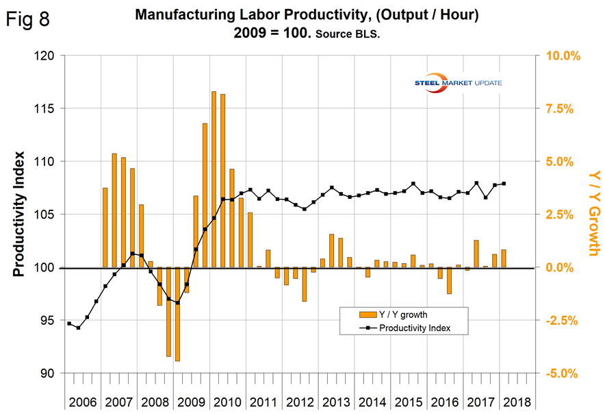 The Bureau of Labor Statistics reported that in Q1 2018 manufacturing productivity improved by 0.8 percent year over year (Figure 8). Productivity growth was erratic in 2017, but there has been a gradual improvement for three years.
