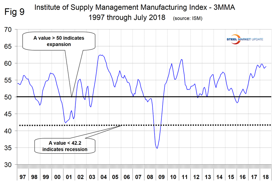 The Institute for Supply Management’s Manufacturing Index is a diffusion index. ISM states: “Diffusion indexes have the properties of leading indicators and are convenient summary measures showing the prevailing direction of change and the scope of change. An index value above 50 percent indicates that the manufacturing economy is generally expanding; below 50 percent indicates the opposite.” Figure 9 shows the 3MMA of the ISM index from January 1997 through July 2018 with an improving trend since January 2016. In July, the 3MMA of the index at 59.0 was up by 0.27 from June and still historically high.