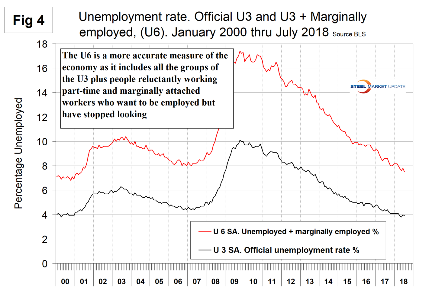 The official unemployment rate, U3, reported in the BLS Household survey (see explanation below) came in at 3.9 percent, down from 4.0 percent in June. This is not a very representative number. The more comprehensive U6 unemployment rate declined from 9.2 percent in January last year to 7.5 percent in July (Figure 4). In July, the difference between these two measures was 3.6 percent, which was the best result since September 2006. U6 includes individuals working part time who desire full-time work and those who want to work but are so discouraged they have stopped looking.