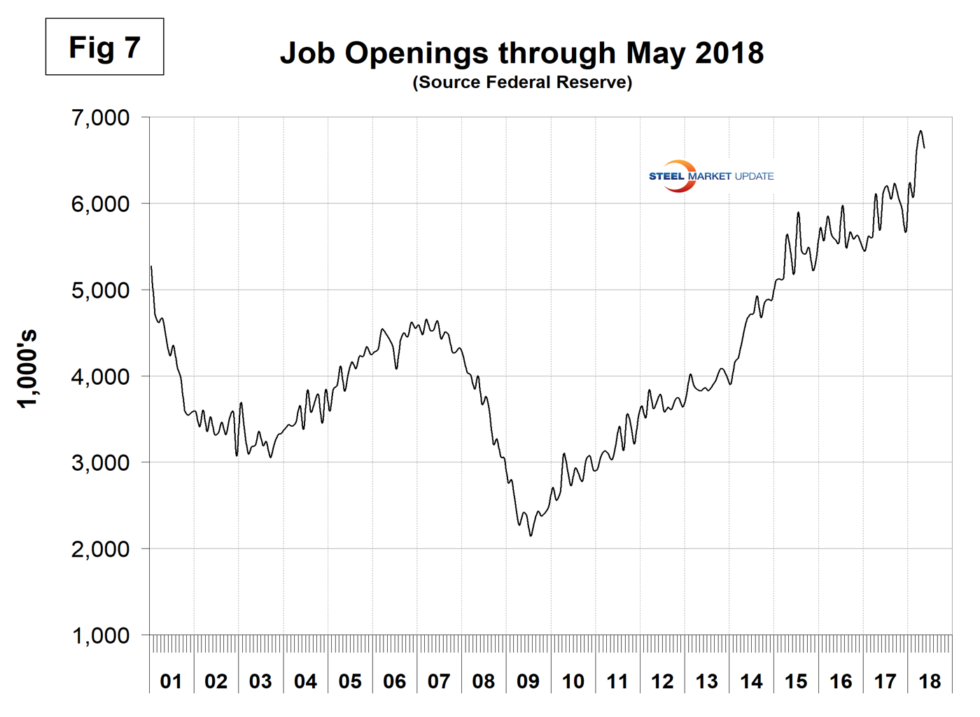 The job openings report known as JOLTS is reported on about the 10th of the month by the Federal Reserve and is over a month in arrears. Figure 7 shows the history of unfilled job openings through May when openings stood at 6,638,000. April had an all-time high of job openings at 6,840,000. There has been an improving trend since mid-2009. This is how Federal Reserve Chairman Jerome Powell sees the situation: “For the first time since the Labor Department began collecting job openings (JOLTS) data in 2000, there are now more job vacancies than there are people counted as unemployed. In addition, the rate at which workers are quitting their jobs is elevated, a sign that workers are able to find another job when they seek one. And surveys show that businesses are finding it difficult to fill vacancies, and that households perceive jobs as plentiful.”