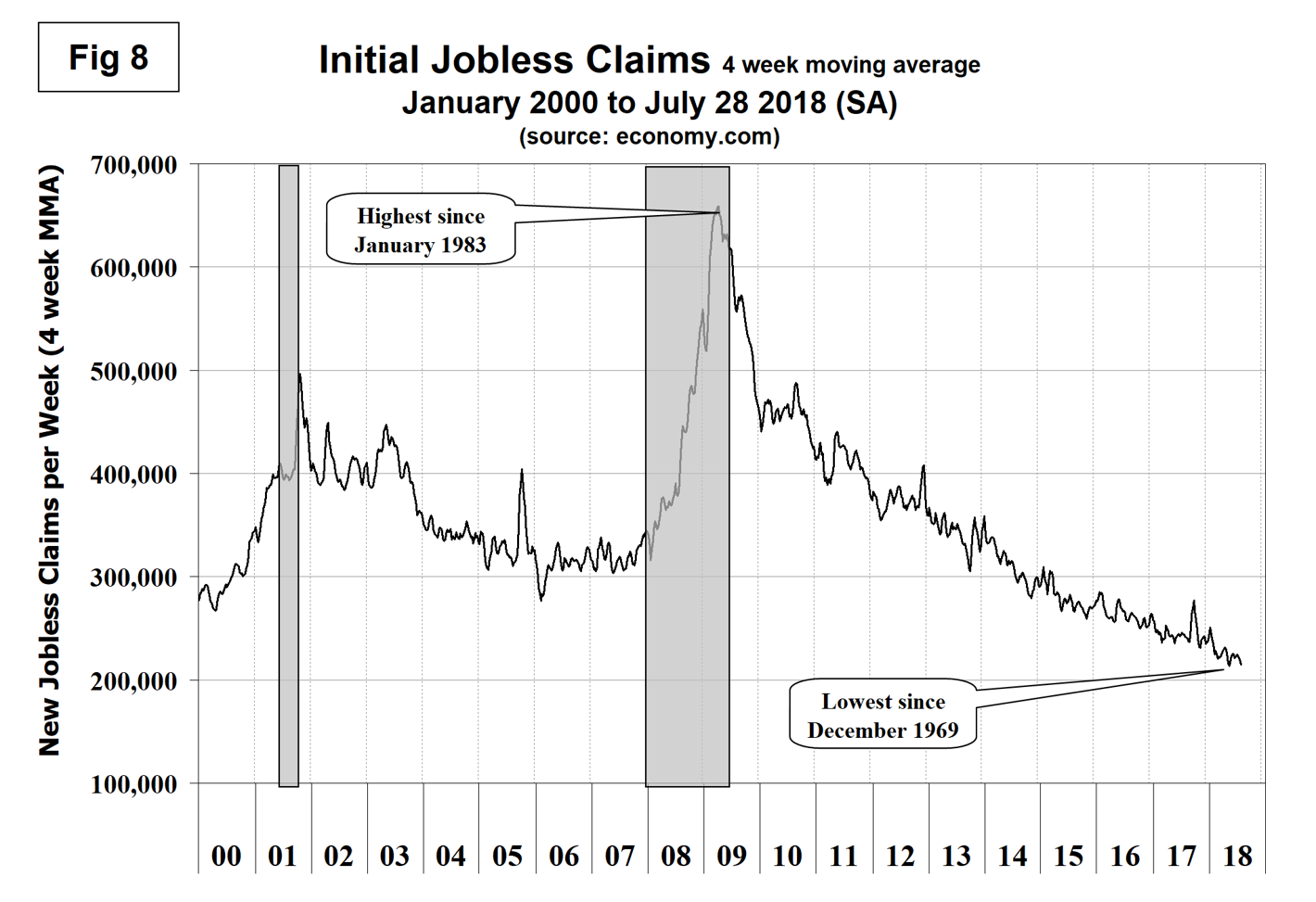 Initial claims for unemployment insurance, reported weekly by the Department of Labor, flattened in 2017 except for the hurricane-driven spike, then resumed their decline in 2018. New claims in the last few months have been at the lowest level since 1969. In the week ending July 28, initial claims totaled 218,000 with a four-week moving average of 214,500 claims. This is a continuation of the longest streak since 1973 of initial claims below 300,000 (Figure 8).