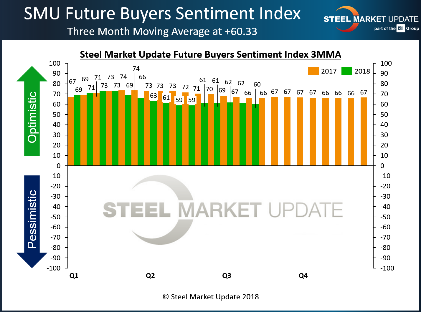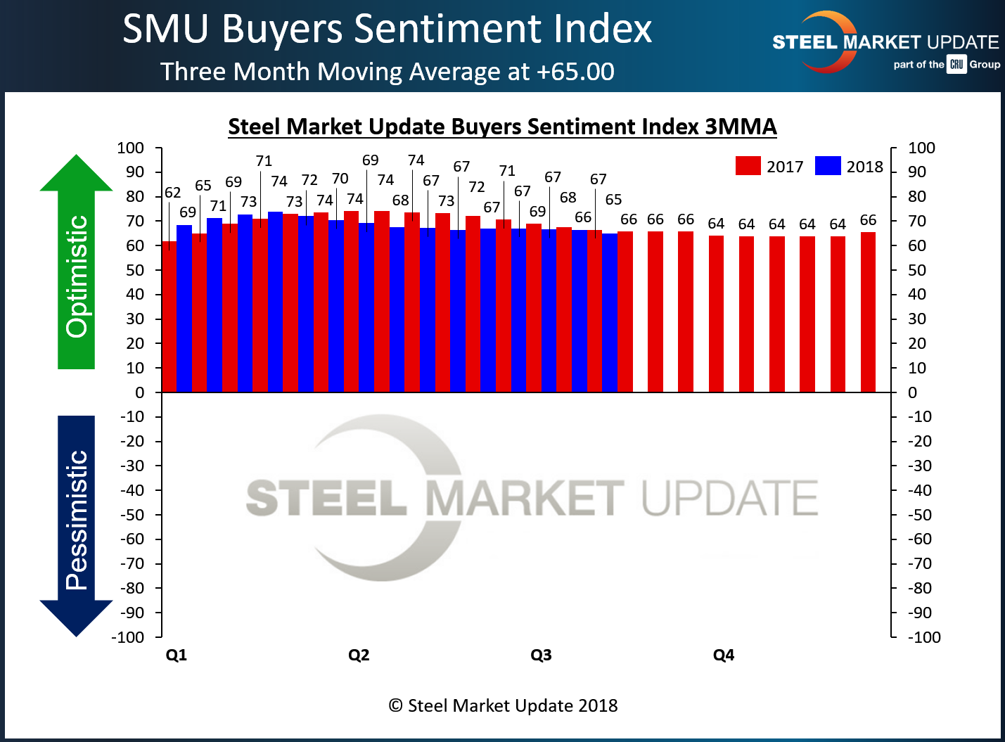 SMU’s Current Steel Buyers Sentiment Index measures how buyers and sellers of flat rolled and plate steel feel about their company’s ability to be successful in the “current” market environment. The index registered +65 out of a possible +100 this week, down 1 point from mid-July and relatively unchanged for the past three months. Calculated as a three-month moving average (3MMA) to smooth out the data, the Current Sentiment index dipped further to +65.00, down from +66.33, and hit the lowest reading of the year. The Current Sentiment Index continues to be optimistic, but well below the 3MMA peak of +73.83 in mid-February.