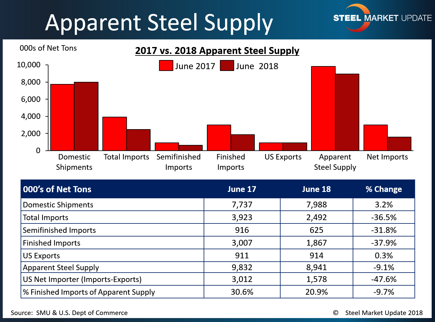 June apparent steel supply fell 7.4 percent over May to 8,941,089 net tons, according to government data released late last week. Although down somewhat, supply remains in line with levels of the last three years. Apparent steel supply is calculated by adding domestic steel shipments and finished U.S. steel imports, then subtracting total U.S. steel exports.