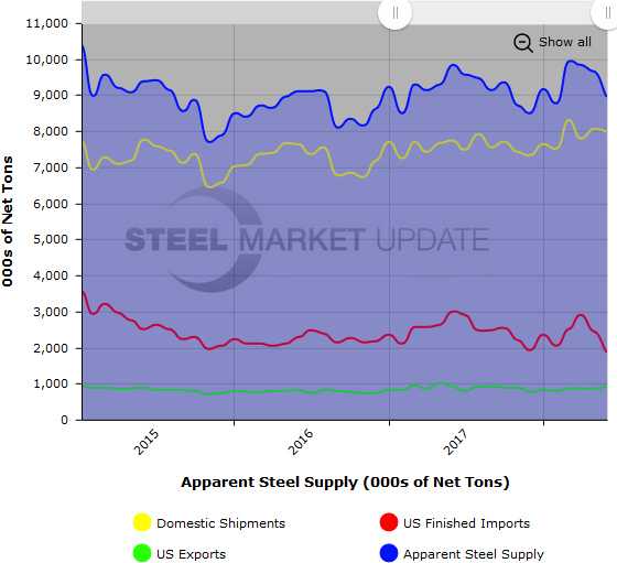 To see an interactive graphic of our Apparent Steel Supply history (example below), visit the Apparent Steel Supply page in the Analysis section of the SMU website. If you need any assistance logging in or navigating the website, contact us at info@SteelMarketUpdate.com or 800-432-3475.