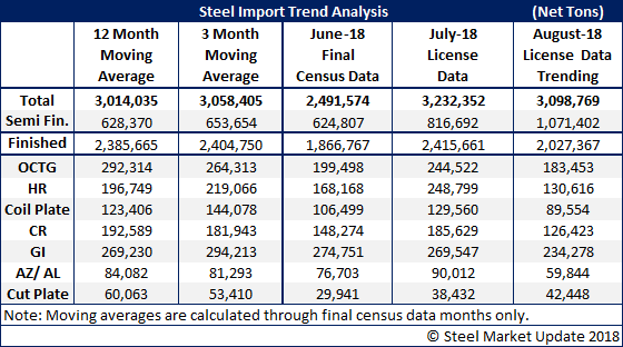 If nothing else, foreign steel imports are resilient. After June imports came in at 2,491,574 net tons, July headed right back to 3.2 million net tons on the back of the domestic steel mills who imported approximately 800,000 of slabs. Now, based on August license data through today (Tuesday, Aug. 14), the domestic mills are once again leading the way as imports are “trending” to another 3 million net ton month. As of today, slab imports (semi-finished steels) are trending toward a 1 million net ton month. However, when looking at finished steels the month is trending toward a 2-million-ton level, which is significantly lower than the 12-month moving average (2.4 million tons) and the 3-month moving average (2.4 million tons).