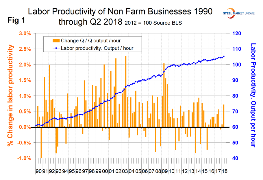 Unit labor costs and productivity changes are reported quarterly by the BLS and results for Q2 2018 were released this week. This basic information is required to truly understand the steel market. One way of looking at GDP is that it is the growth of the working age population multiplied by their productivity. Steel consumption is correlated with the growth of GDP.