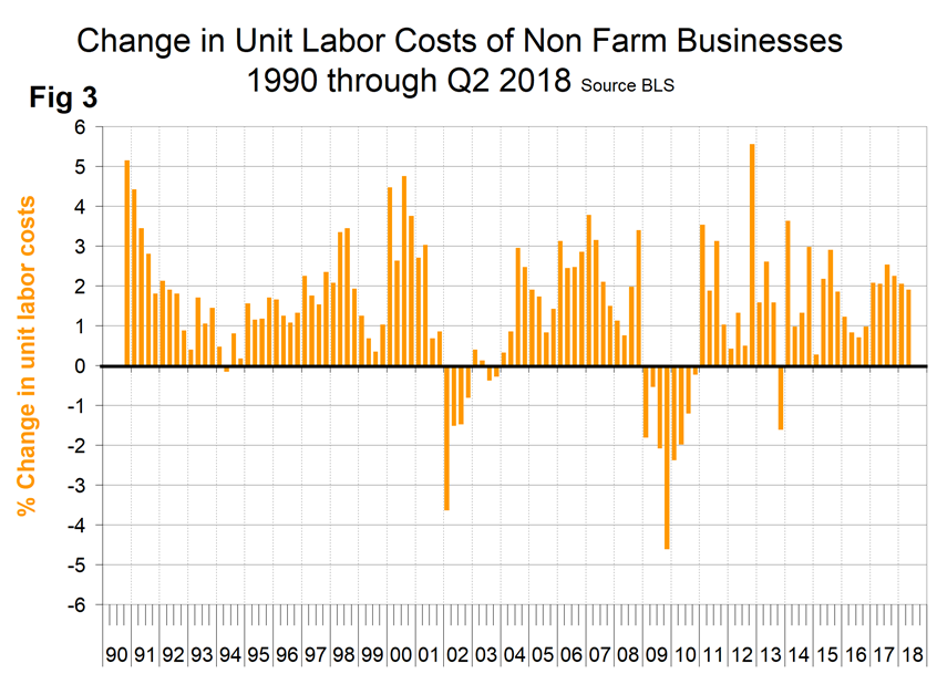 In the second quarter, unit labor costs declined by 0.9 percent based on the previous quarter at an annual rate. Figure 3 shows the change in unit labor costs since Q1 2000 and that the cost increase has been around 2 percent for the last six quarters.