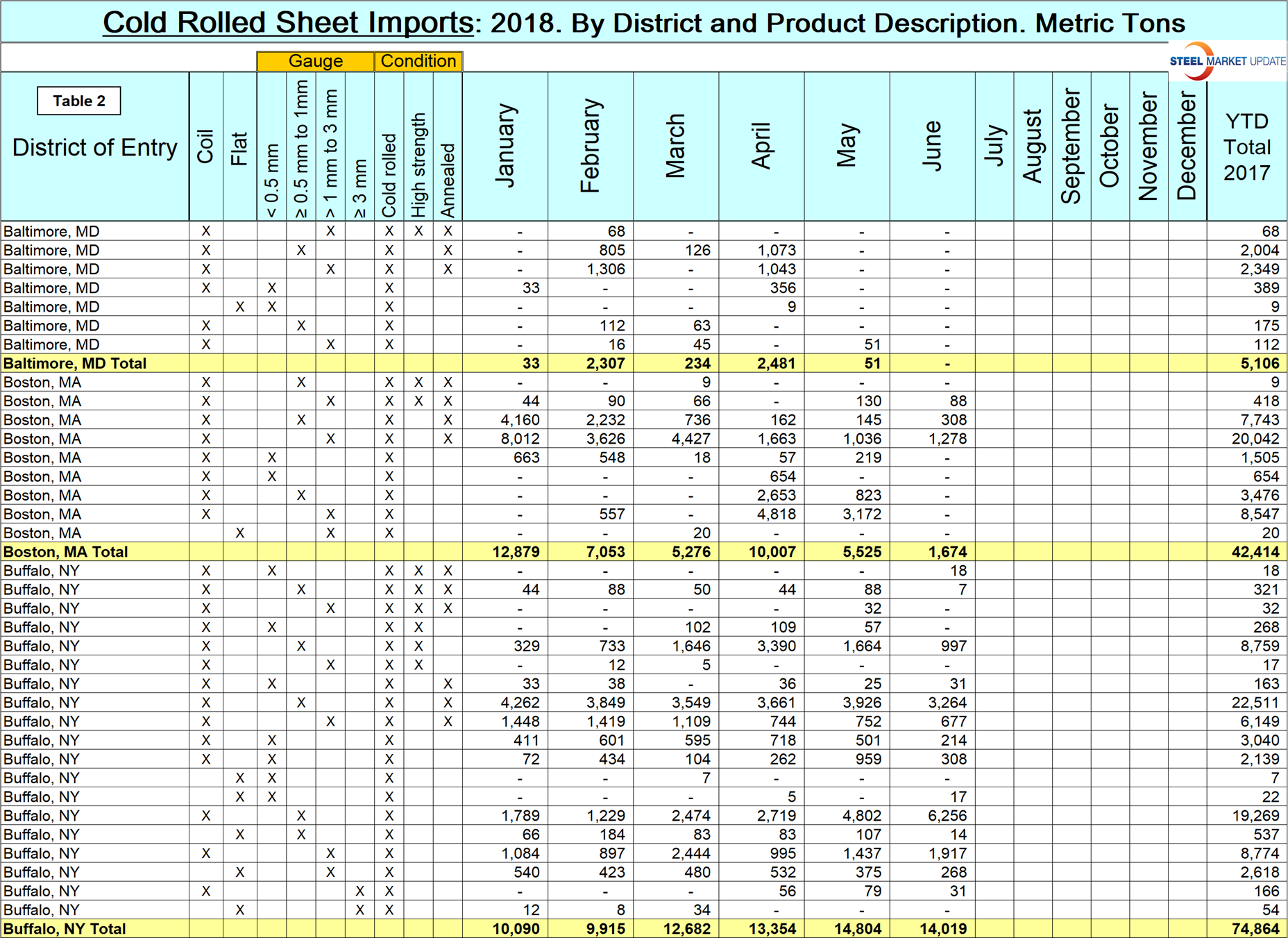 Table 2 (click to enlarge) is a small part of a sheet that shows detail for every region in the U.S. and is available here for premium SMU members. It shows the product detail of cold rolled sheet imports by district of entry. For example, almost half the tonnage entering Boston in the first six months of 2018 was 1 to 3 mm thick, annealed. Another example: if a steel buyer wanted to know how much of the same product came into Houston year to date, the answer is 21,275 tons, which was the highest volume item into that district.
