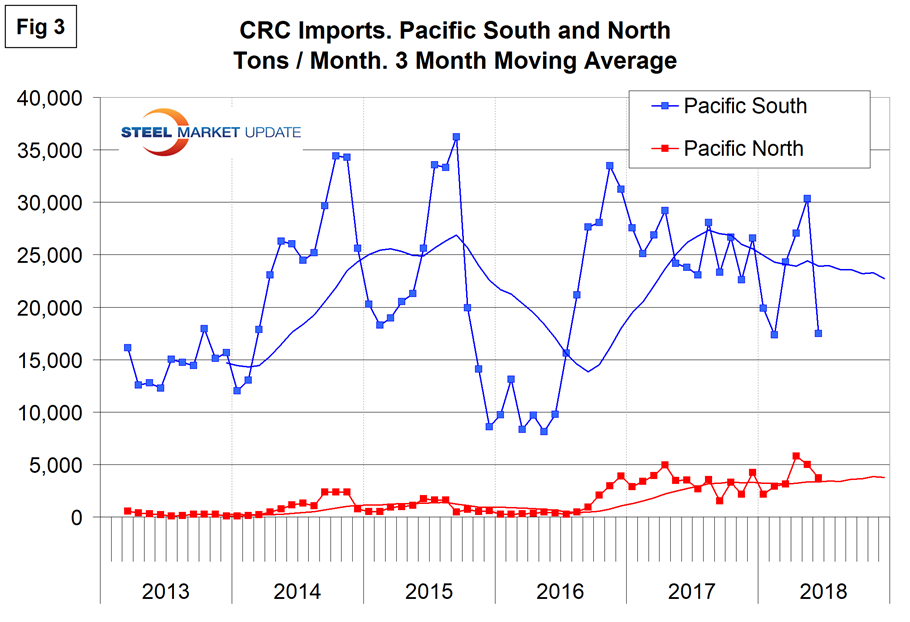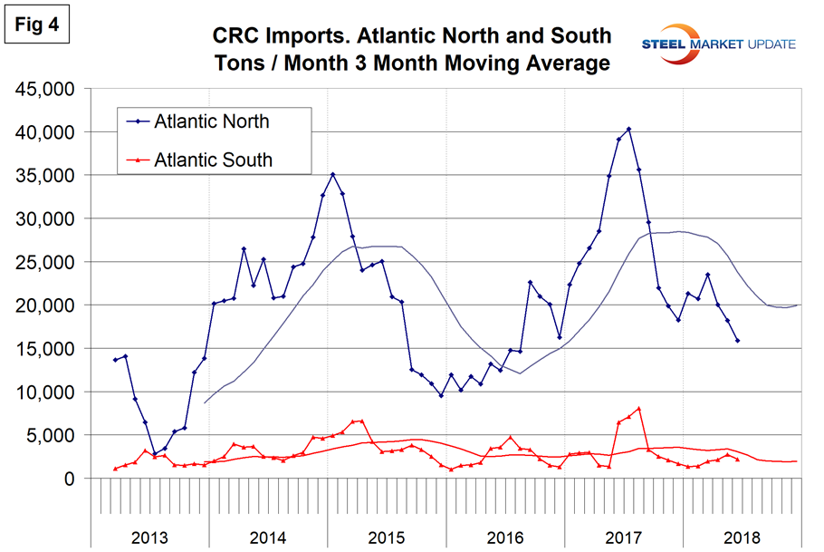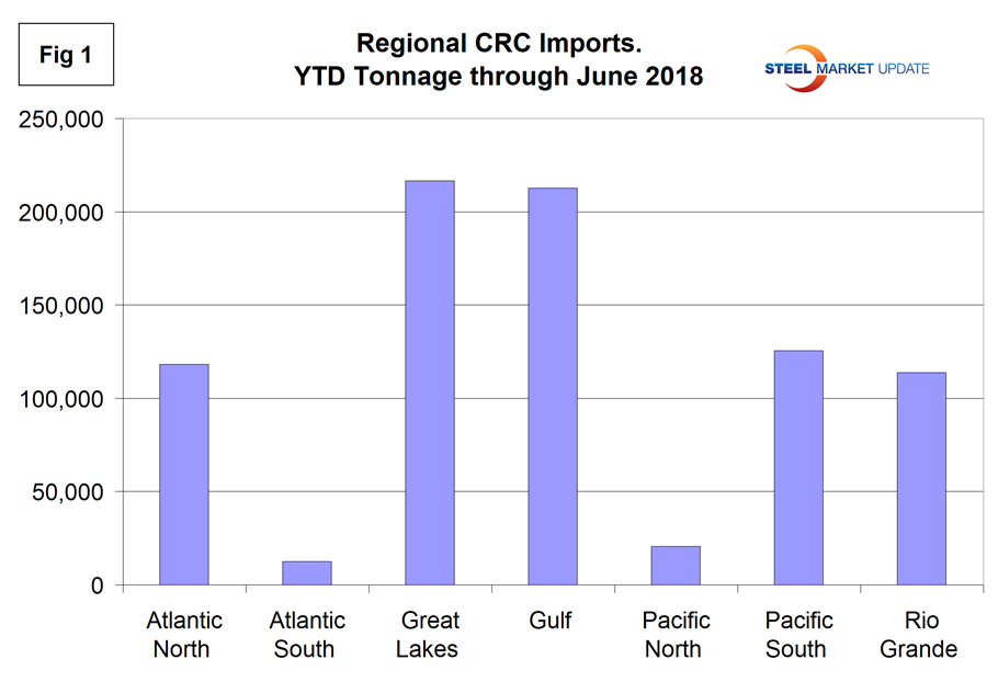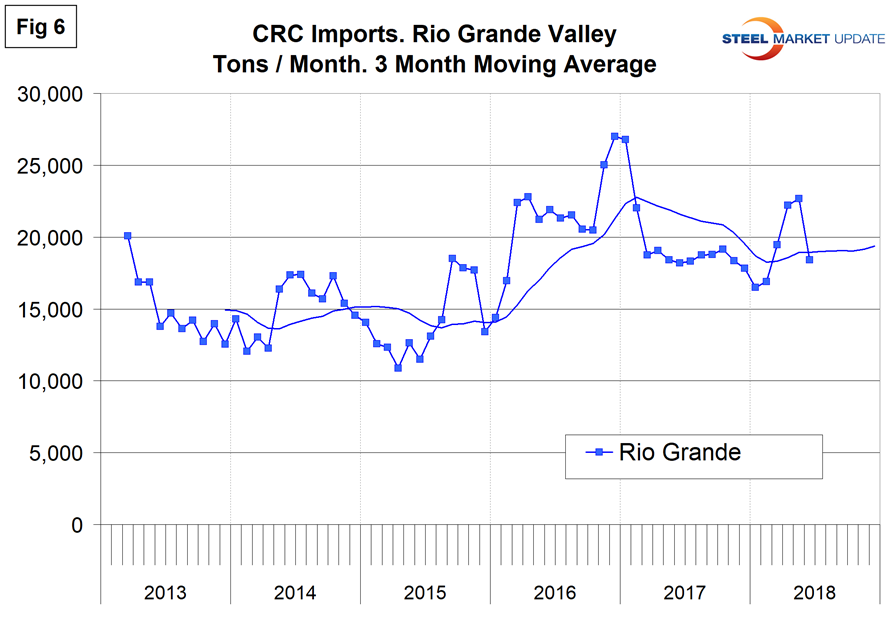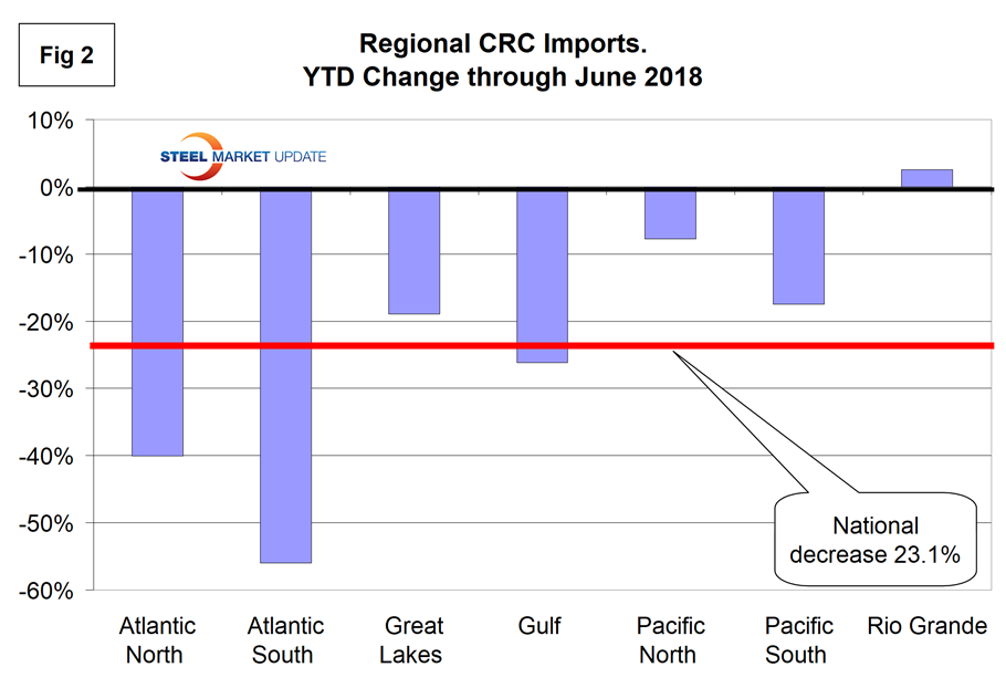 Imports of cold rolled coil into the U.S. as a whole were down 23.1 percent year to date in June, but the Atlantic South was down by 56 percent and the Rio Grande Valley was up by 2.5 percent.