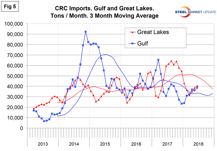 Imports into the Great Lakes and Gulf, which are the highest volume regions for cold rolled, have been almost identical in the first half of 2018. Both trended down in the second half of 2017.