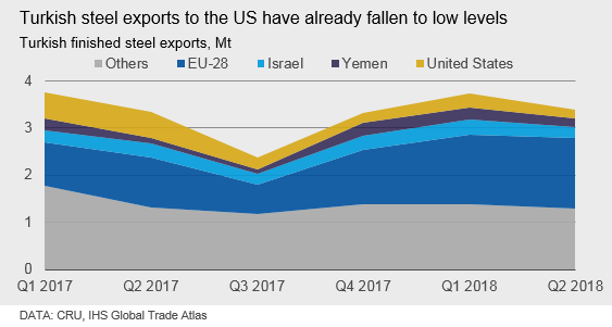 Overall, while a loss of U.S. export volumes is not great news for Turkish mills, the impact is limited. Turkish exports to the U.S. have fallen since late 2017 due to an initial duty of 8 percent applied in mid-2017 and then because of additional tariffs due to the Section 232 investigation. For example, Turkey exported 88 kt of finished steel to the U.S. in June 2018, only 6.4 percent of its export volume and less than 3 percent of total steel production. While the U.S. represents a small portion of Turkish steel exports, Turkish steel is a large source of steel for the U.S., representing 23 percent of U.S. total finished steel imports.