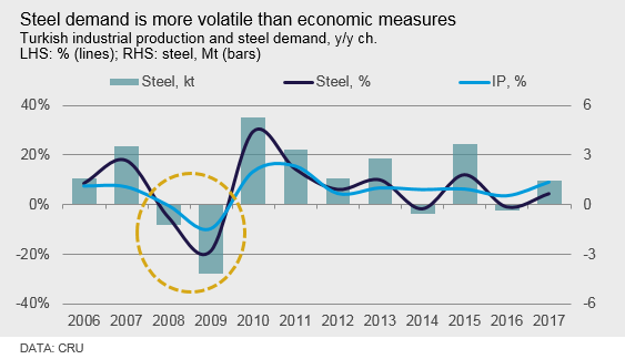Because of the potential for economic woes to be prolonged, Turkish domestic steel demand may drop in 2019. Ultimately, this will cause more damage than restricted access to the U.S. and EU markets for steel exports. Steel demand is intrinsically linked to economic growth, in particular investment and industrial output. Turkish GDP grew by more than 7 percent year over year in 2017 and was already expected by CRU Economics to drop to around 4 percent before the current crisis developed, because we expected stimulus measures to be eased.