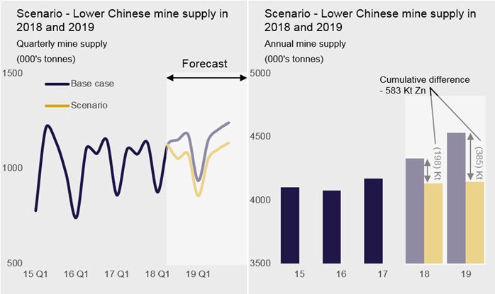 This scenario envisages mine supply falling to 4.13 Mt in 2018 (down from 4.17 Mt in 2017) and remaining flat in 2019 at 4.15 Mt. The net effect of this scenario from our base case would be a reduction of 583,000 metric tons of zinc in concentrate over the six quarters between 2018 Q3 and 2019 Q4.